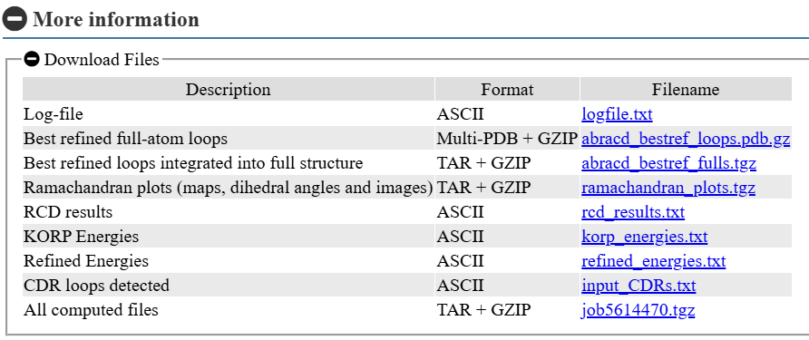 Predicted loops can be downloaded either as isolated loop PDB files or integrated into the full antibody structure, and all job-related files are available for download either individually or together as a single Tar+GZip archive.